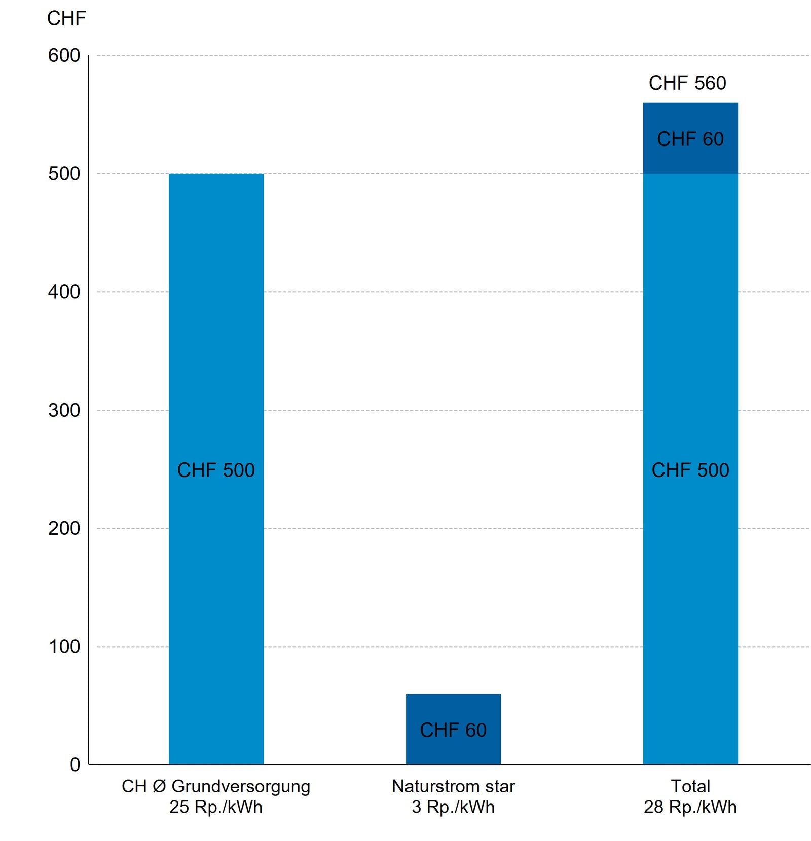 Für einen Schweizer 2 Personenhaushalt mit einem Paket-Upgrade auf Generationenstrom ergibt sich folgende Beispielrechnung: Bezug von jährlich 2000 kWh Strom in der Grundversorgung (Ø 25 Rp/kWh) für CHF 500 und Upgrade auf Naturstrom star für 2 Personenhaushalt (+3 Rp/kWh) für den Aufpreis von CHF 60.